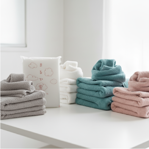 商品名は自信の表れ。その名も「まるで雲」 まるで雲を掴んでいるような柔らかさを持ったタオルです。その秘密は糸の撚りを極限まで少なくしたスーパー弱撚糸を使用しているから。なおかつ無撚糸よりも毛羽落ちが少なく、吸水性も抜群。吸水試験、沈降法でも1秒以内に水に沈むほどの吸水力。一度使用すると他のタオルには戻れません。サイズはバスタオルとしては小さめ設計ですが、かさばらずちょうどいいサイズとなっております。